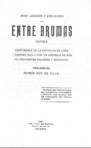 Título: Entre brumas : novela : costumbres de la provincia de León, Cabrera Baja : con un apéndice de más de trescientas palabras y modismos / José Aragón y Escacena; prólogo de Ramón Goy de Silva