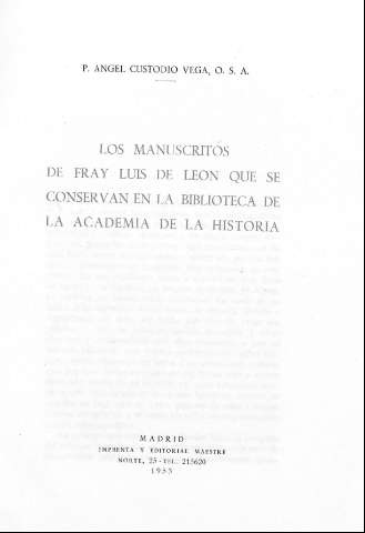 Título: Los manuscritos de Fray Luis de León que se conservan en la biblioteca de la Academia de la Historia / P. Angel Custodio Vega, O.S.A