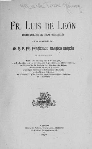 Título: Fr. Luis de León : estudio biográfico del insigne poeta agustino / obra póstuma del R. P. Fr. Francisco Blanco García