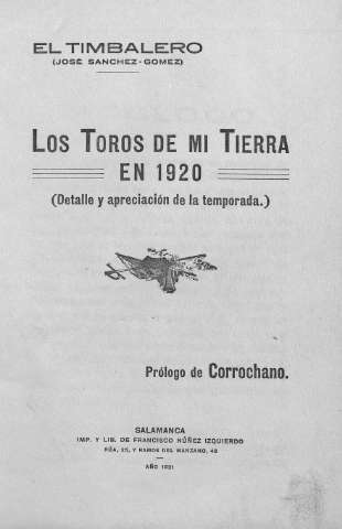 Título: Los toros de mi tierra en 1920 : detalle y apreciación de la temporada / El Timbalero (José Sánchez-Gómez) ; prólogo de Corrochano