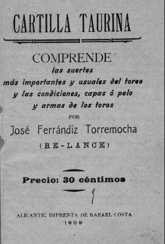 Título: Cartilla taurina : comprende las suertes más importantes y usuales del toreo y las condiciones, capas ó pelo y armas de los toros / por José Ferrándiz Torremocha (Be-Lance)