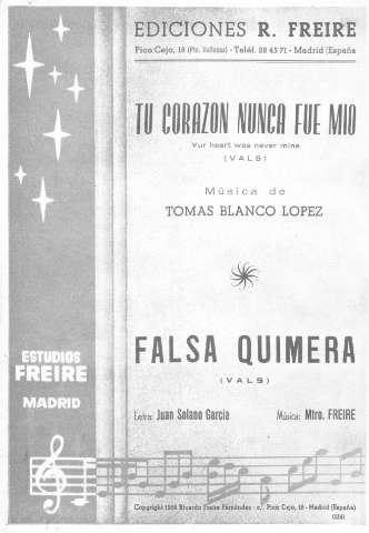 Título: Tu corazón nunca fue mío [Música impresa]= Yur [sic] heart was never mine : vals / música de Tomás Blanco López. Falsa quimera : vals / letra Juan Solano García; música del maesto R. Freire