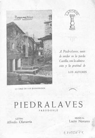 Título: Piedralaves [Música impresa]: pasodoble / letra de Alfredo Olavarría; música de Lucio Navarro