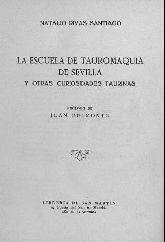 Título: La escuela de tauromaquia de Sevilla y otras curiosidades taurinas / Natalio Rivas Santiago ; prólogo de Juan Belmonte