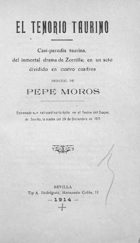 Título: El tenorio taurino : casi-parodia taurina, del inmortal drama de Zorrilla, en un acto dividido en cuatro cuadros / original de Pepe Moros