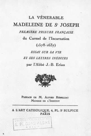 Título: La vénérable Madeleine de St Joseph : première prieure française du Carmel de l¿Incarnation (1578-1637) : essai sur sa vie et ses lettres inédites / par l¿Abbé J.-B. Eriau ; préface de M. Alfred Rébelliau ...