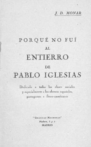 Título: Por qué no fui al entierro de Pablo Iglesias : dedicado a todas las clases sociales y especialmente a los obreros españoles, portugueses e ibero-americanos / J.D. Monar.