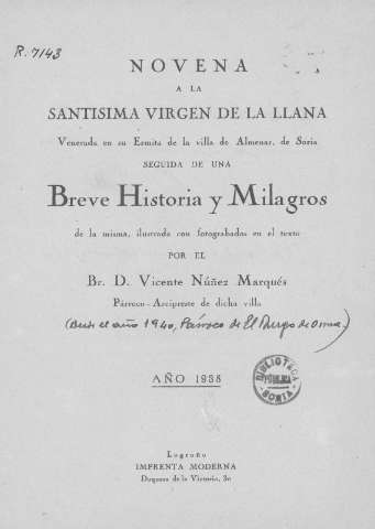 Título: Novena a la Santísima Virgen de la Llana, venerada en su ermita de la villa de Almenar de Soria ; seguida de una breve historia y milagros de la misma / por el Br. Vicente Núñez Marqués.
