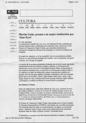 Artículo de "El País digital" (15 noviembre 2000), sobre la concesión a Martín Gaite del III Premio de Traducción Ángel Crespo