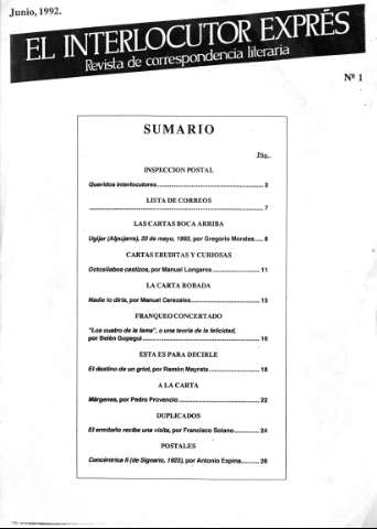 Números 1 a 16 de la revista, redactada entre junio de 1992 y abril de 1994. Entre los redactores aparecen los siguientes nombres: Carmen Martín Gaite, Gregorio Morales, Ramón Mayrata, Pedro Provencio, Ulpiano Ros, Belén Gopegui, Manuel Cerezales, Francisco Solano, Santiago Silvester, Eloy Tizón, Manuel Longares, Agustín Cerezales, Tomás Segovia, Emilio Williams, Luis Mateo Díez, Manuel Borrás Arana, Luisa Castro, Antonio Fernández Lera, Agustín Cerezales, Juan Renales, Samuel Florido, Isabelita Especulum.