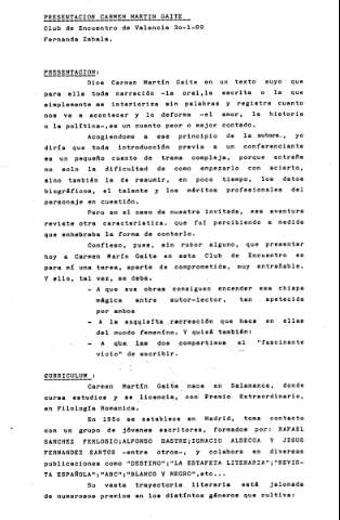 Presentación de Fernanda Zabala: "Carmen Martín Gaite", Club de Encuentro de Valencia , 30-1-89.