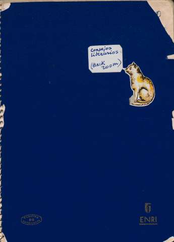 Cuaderno manuscrito con reflexiones, notas personales y apuntes diversos, a veces fechados. En la cubierta "Consejos literarios (Back zoom)", y en la primera página "Cuaderno de todo". Algunos textos con epígrafes en mayúsculas, subrayados o enmarcados: "Las encuestas", "Navidad de plástico", "Para un cuento fantástico", [reflexiones sobre el lenguaje, la narración y la literatura], [empieza:] "Esto puede enlazar con el tema de "pesquisa personal"...", "Desdoblamiento, metamorfosis", "El interlocutor", [fotografía de "Agustín" recortada de El País (9 enero 1977)], "La obligación y la devoción. Saber protagonizar lo que se cuenta (credibilidad)", "Amor", "Para lo de Manolo Alvar", "Elaboración", "Sed de interlocutor", "Mentira amorosa", "Hazme creer / creeme", "Para Buzzati", [Nota manuscrita de Nacho, fechada a 30 de enero], "Intriga", "Para el artículo sobre Hermann Hesse", "Vargas Llosa", "La conciencia tranquila". Dibujo.