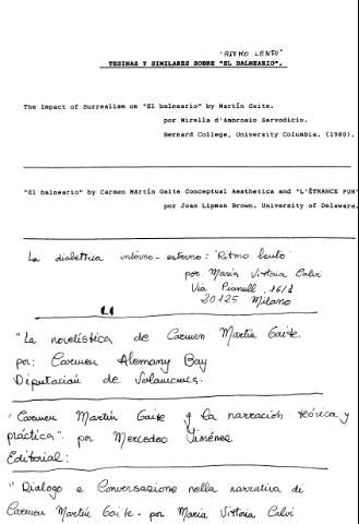 Listado mecanografiado y manuscrito de tesinas y estudios sobre la obra de Carmen Martín Gaite tanto españolas como extranjeras.