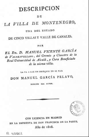Título: Descripción de la villa de Montenegro, una del estado de Cinco Villas y Valle de Canales / Manuel Vicente García