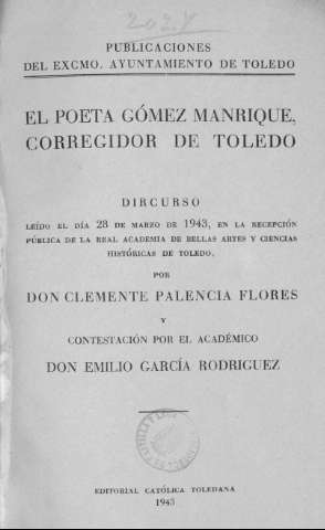Título: El poeta Gómez Manrique, corregidor de Toledo : discurso leído el día 28 de marzo de 1943 en la recepción pública de la Real Academia de Bellas Artes y Ciencias Históricas de Toledo / por Clemente Palencia Flores; y contestación por Emilio García Rodríguez