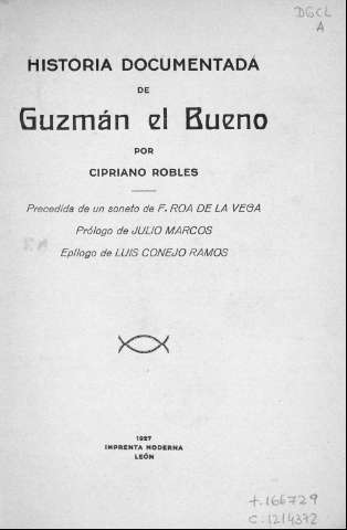 Título: Historia documentada de Guzmán el Bueno / por Cipriano Robles ; precedida de un soneto de F. Roa de la Vega ; prólogo de Julio Marcos ; epílogo de Luis Conejo Ramos