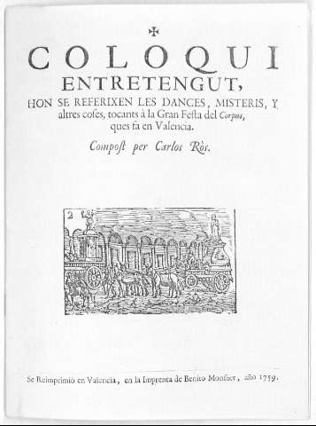 Título: Coloqui entretengut, hon se referixen les dances, misteris y altres coses, tocants a la gran festa del Corpus ques fa en Valencia / compost per Carlos Ròs