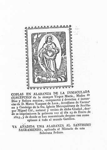 Título: Coplas en alabanza de la Inmaculada Concepción de la siempre Virgen María, Madre de Dios y Señora nuestra, compuestas a devocion e instancias de D.Mateo Vázquez de Leca, Arcediano de carmona y Canónigo de la Sta. Iglesia metropolitana de Sevilla .Va añadida una alabanza al Santísimo Sacramento, aplicada al Misterio de esta Soberana Señora / por Miguel Cid, natural y vecino de dicha ciudad, donde se imprimieron por primera vez el día 23 de enero de 1625, y de donde se han comunicado después con sumo aplauso á todo el mundo Católico