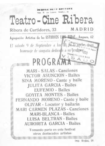 Título: Teatro-Cine Ribera : programa de la actuación del 9 de septiembre en homenaje al profesor de la Agrupación Artística de los Estudios Luis Ribas