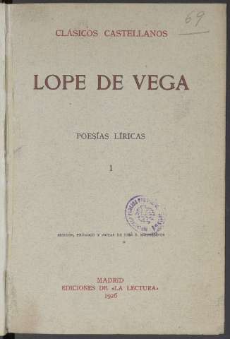 Título: Poesías líricas / Lope de Vega ; edición, prólogo y notas de José F. Montesinos.