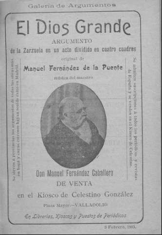 Titre: El Dios grande : argumento de la zarzuela en un acto dividido en cuatro cuadros, original de Manuel Fernández de la Puente, música del maestro Manuel Fernández Caballero.